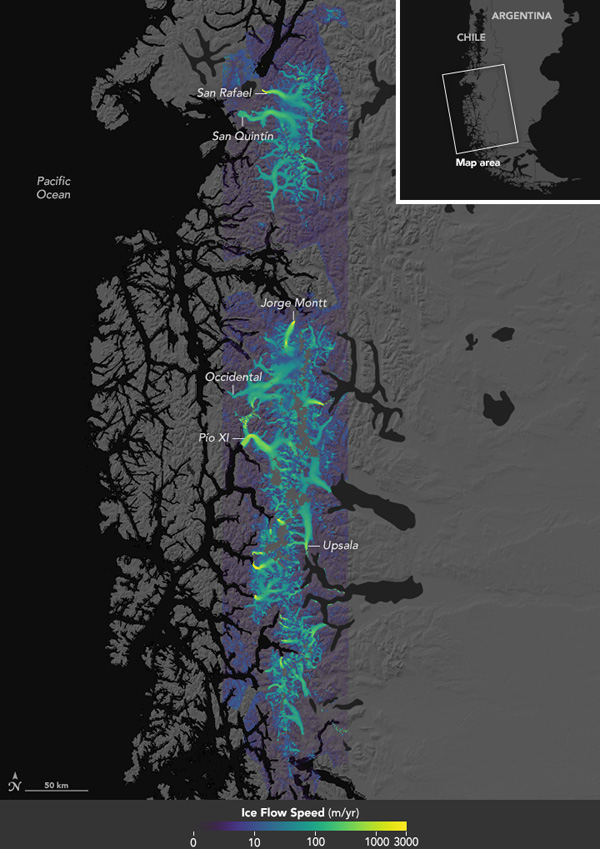 Les scientifiques étudient depuis longtemps la vitesse de la glace en Patagonie. Au fil des ans, ils ont cartographié la vitesse de quelques-uns des glaciers, à partir d’observations sur le terrain et de données d’interférométrie radar fournies par plusieurs satellites entre 1984 et 2014. Cette approche a révélé une image très variable de la vitesse de la glace. La différence dans les eaux, chaudes et salées à l’ouest, plus froides et plus fraîches à l’est, contrôle également le vêlage et la dynamique interne des glaciers qui terminent leur course dans un lagon ou dans la mer. La fonte des fronts de glaciers due à la chaleur des océans peut faire fondre les glaciers de l’ouest de la Patagonie cinq à dix fois plus vite que ceux de l’est.