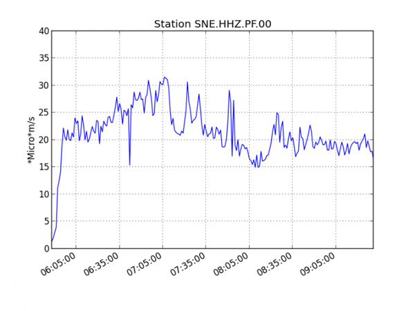 Evolution du tremor volcanique entre 09h48 et 13h30 (heure locale) le 18 février. (Source: OVPF)