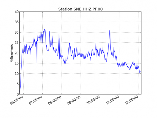 Evolution du tremor volcanique entre 09h48 et 16h15 (heure locale) le 18 février. (Source: OVPF)