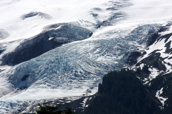 Boulder Glacier on Mt Baker reminds me of Athabaska in the Canadian Rockies which is retreating in the same way. Every summer it loses between 10 and 25 metres in length. It has lost about 2 kilometres since 1844, the Little Ice Age period. It measures 6 kilometres today, versus 8 kilometres in the mid 19th century. Landmarks show how fast the glacier is retreating.