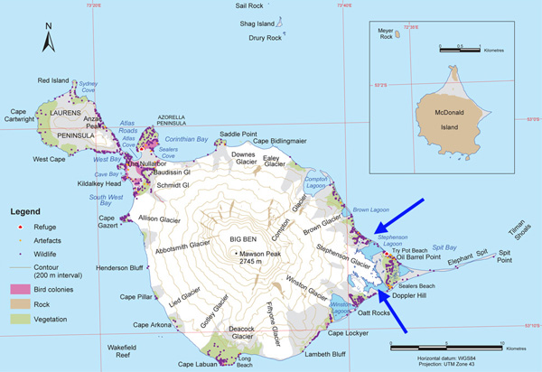 What interest us here is the glaciers of the island. More generally, we know that the melting of glaciers shapes new landscapes and sometimes creates new opportunitiess for the wildlife. This is what is happening on Heard Island where the Winston, Brown and Stephenson Glacier have all retreated substantially since 1947, a year when the first good maps of their terminus are available.