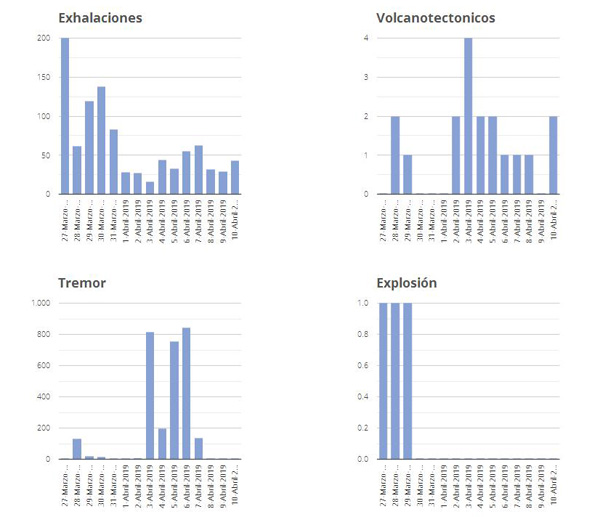 An overflight of the volcano was performed on April 8th but it was not possible to corroborate or discard the presence of a new lava dome in the crater because of the intense cloudiness, in addition to a high emission of steam and gases in the crater area. Although explosive activity has decreased in the past days, CENAPRED emphasizes that people should not go near the volcano, especially near the crater, and in case of heavy rains leave the bottoms of ravines because of the danger of lahars.