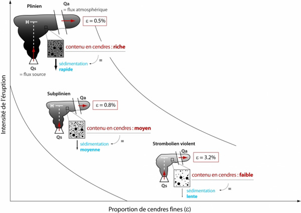 Schéma illustrant les mécanismes de sédimentation et de transport des cendres volcaniques pour différents styles éruptifs. (Source : Mathieu Gouhier / LMV)