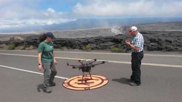 Cela fait des décennies que des hélicoptères et des avions véhiculent les volcanologues du HVO, ce qui leur a permis de bonnes observations visuelles et thermiques, d’entretenir les équipement sur le terrain et d’effectuer des mesures géophysiques et géochimiques. L’éruption du Kilauea en 2018 a été l’occasion d’adopter une nouvelle technologie aéroportée – les drones, aussi appelés UAS (Unmanned Aircraft Systems en américain) – pour mieux surveiller l’évolution de l’éruption.