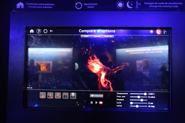 Dès l’entrée, on entre dans le vif du sujet grâce à un tunnel de lave dont les vibrations rappellent l’importance de la sismicité sur un volcan. Toute la technologie moderne a été utilisée pour rendre le site attractif. Les écrans interactifs, en particulier, séduisent le jeune public. Les explications – bilingues français-anglais – sont sobres et on n’a pas l’impression désagréable – comme à Vulcania – que des universitaires ont voulu déverser leurs connaissances.