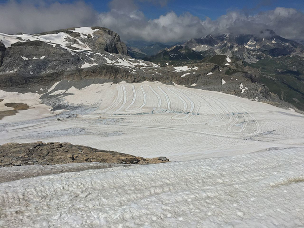 Cet été, plusieurs secteurs du domaine ont été bâchés pour freiner la fonte du glacier. L’ouverture automnale sera ajustée en fonction des précipitations neigeuses à venir.