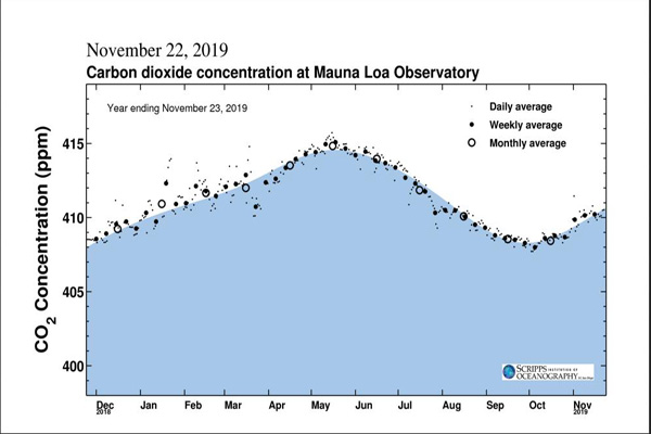 La Courbe de Keeling sur une année. On voit parfaitement la hausse entre décembre 2018 et 2019 (Source: Scripps Institution).