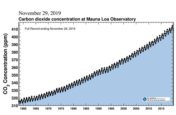 Following my post of December 1st, 2019, which warned of the climate emergency, here are the latest figures published by the World Meteorological Organization (WMO) concerning the levels of CO2 and other greenhouse gases on our planet. As NOAA’s real-time readings showed, the atmospheric CO2 concentration reached 407.8 ppm, a record high. This figure has progressed, with a current concentration above 410 ppm on Mauna Loa (Hawaii) where measurements are being made.