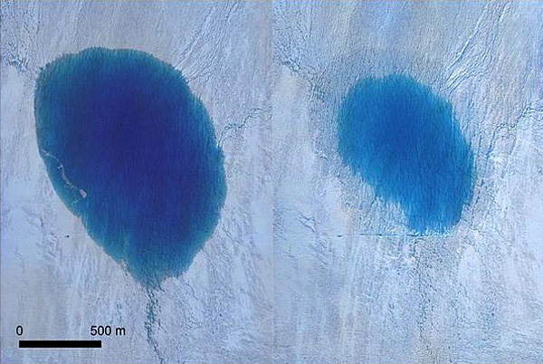 Vue d’un lac de surface au Groenland avant et après sa vidange (Source: University of Cambridge)