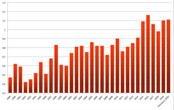 2015 was the first year during which the global average temperature exceeded 1.0°C above the pre-industrial period (1850-1900). The hottest year on record was 2016 with + 1.16°C, largely due to the warming caused by El Niño in the tropical Pacific. 2020 should be another very hot year, around + 1.11°C, but without the influence of El Niño which is supposed to add almost 0.2°C during extreme events.