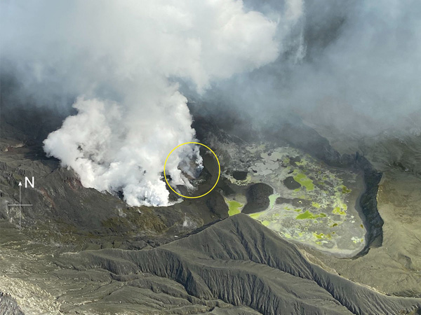 Vue du cratère de White Island et des bouches actives le 14 décembre 2019 (Source: GNS Science)…