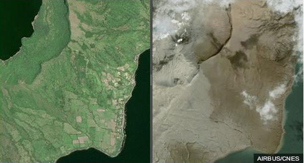Satellite pictures (see below) reveal how much ash has fallen over the area around the volcano.