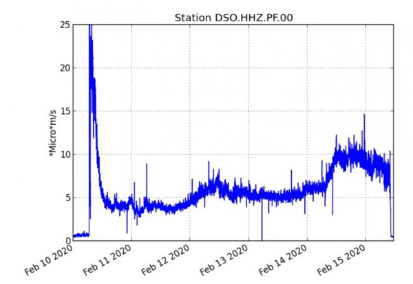 The first eruption of 2020 might be coming to an end. Indeed, starting at 2 p.m., the tremor quickly dropped on Saturday February 15th, 2020. A residual tremor has however been recorded since 2:20 pm at the two seismic stations closest to the eruptive site.