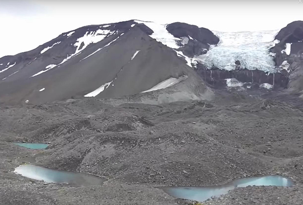 Sur ces images extraites de la vidéo, on a l’exemple parfait d’un glacier – le Klofajökull- en pleine phase de recul, avec rupture de sa partie frontale. La deuxième image montre une vue de l’encaissant encre très récent du glacier. Sur la troisième photo, on peut voir les matériaux laissés par le Klofajökull pendant son recul, avec les habituels lacs de fonte. Ne pas s’aventurer sur cette zone où les pièges sont nombreux.