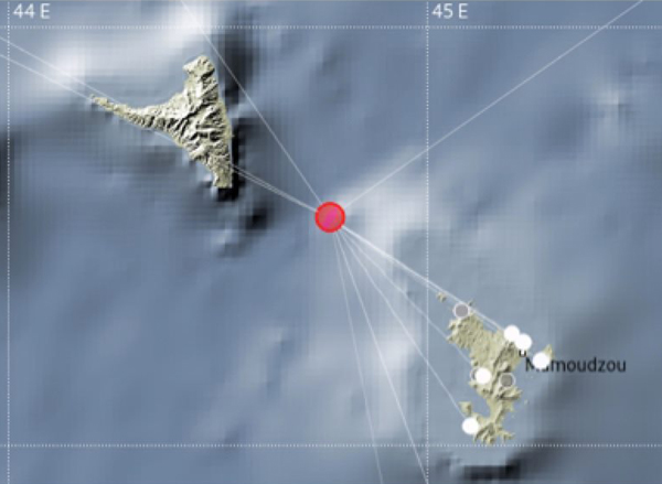 S’agissant de la localisation de ce dernier séisme, elle est différente des précédents dont les épicentres se situaient en général à l’est de l’île, dans le secteur de l’éruption sous-marine. Cette fois, le séisme a été localisé entre les îles de Mayotte et Anjouan, donc au nord-nord-ouest de Mayotte, à 47 km de Mamoudzou. L’hypocentre a été estimé à une profondeur de 30 km.