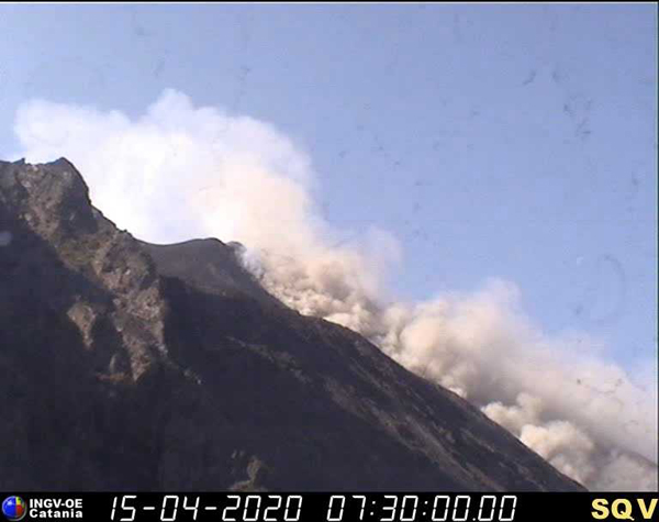 As soon as something unusual happens on a volcano, the information spreads on social networks at the speed of light. This is what happened on April 15th, 2020 when a landslide was observed on Stromboli’s Sciara del Fuoco (Sicily). According to the Laboratorio Geofisico Sperimentale, the event occurred in the morning and lasted about 20 minutes. It was recorded by the seismic network and could be seen on the webcam. The rest of the time, activity at Stromboli is characterized by scoria-rich strombolian explosions, with sporadic ash emissions, located at the NE crater.