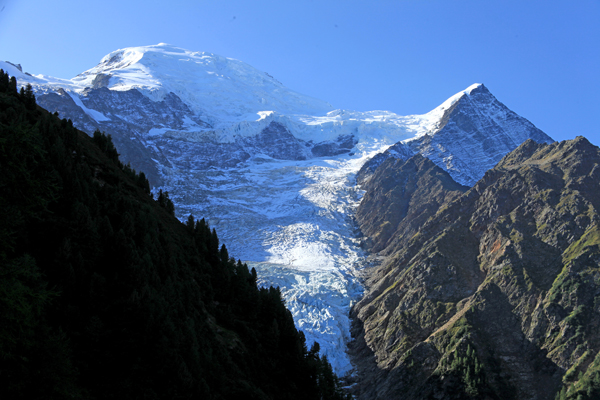 Several of these very high altitude glaciers, known as « hanging glaciers », are located on very steep slopes and owe their stability to their negative internal temperature. If the base of these glaciers were to reach the melting temperature of the ice, this could affect their stability and cause very massive ice avalanches. A glacier like that of Taconnaz, which clings to a slope of more than 40 degrees, threatens dwellings in the municipality of Les Houches. It is, however, impossible to know when it might break loose.