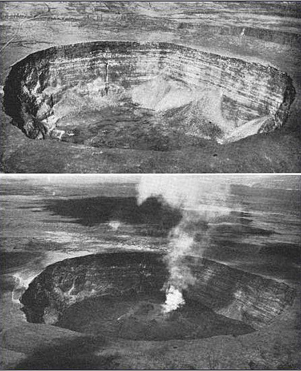 Vue du cratère de l’Halemaumau le 26 juin 1952, veille du début de l’éruption (photo du haut), et de ce même cratère (photo du bas) quatre semaines plus tard. Comme indiqué dans la description de l’éruption, le plancher s’est élevé de 230 mètres à 140 mètres sous la lèvre du cratère. (Crédit photo: National Park Service).