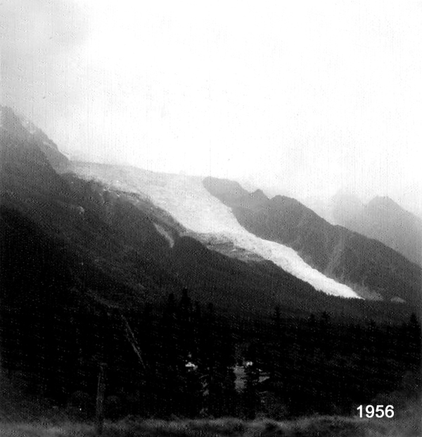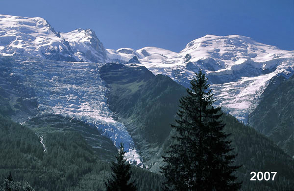 Comme la Mer de Glace, j’ai découvert le Glacier des Bossons en 1956, époque où sa masse blanche surplombait la vallée de l’Arve. Aujourd’hui, tout comme son voisin le Taconnaz, le glacier des Bossons semble avoir pris peur et recule à toute vitesse vers le haut de la montagne. Le phénomène apparaît surtout dans les clichés que j’ai pris depuis les années 1980.