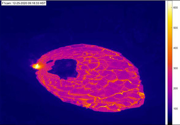 22h00 (heure française): 11h00 (heure locale): Dans le même temps, la situation évolue dans le cratère de l’Halema’uma’u et l’éruption deviendra probablement moins fascinante pour les visiteurs. En effet, tôt le matin du 26 décembre, la bouche ouest s’est réactivé tandis que la bouche nord s’est calmée et a commencé à faire se vider le lac. Les émissions de SO2 sont en baisse; elles sont tombés à 16 000-20 000 tonnes par jour et les panaches de gaz sont beaucoup moins volumineux. Le niveau du lac s’est abaissé d’environ 2 mètres, comme le montre la bande noire autour de son rebord nord Autre changement : les inclinomètres du sommet ont continué à enregistrer une lente déflation jusqu’à un peu avant 3 heures du matin le 26 décembre, date à laquelle ils sont passés en mode inflationniste. La sismicité reste élevée mais stable. L’îlot de lave qui flottait dans le lac de lave s’est immobilisé près de la bouche nord.