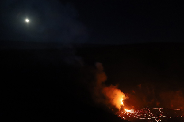 Le lac de lave dans le cratère de l’Halema’uma’u a peu évolué ces derniers jours. Sa surface se situe à environ 408 m sous la lèvre sud du cratère. Son volume est d’environ 23 millions de mètres cubes. Il est de forme ovale. Les dernières mesures ont révélé 770 m sur 490 m pour une superficie d’environ 29 ha. L’étroit rebord en saillie autour du lac montre que sa surface a tendance à baisser.