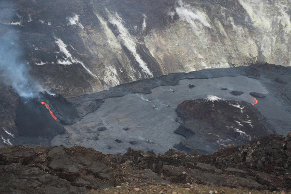 La photo montre aussi qu’il ne s’agit pas d’un véritable de lave comme celui qui s’agitait dans le cratère de l’Halema’uma’u au cours de la dernière éruption du Kilauea , ou encore das les cratères du Nyiragongo ou de l’Erta Ale. Ici, l’image montre qu’il s’agit davantage d’un épanchement de lava alimentée par une bouche sur la paroi interne du cratère. Cette lave émise s’accumule ensuite dans la cratère mais ne présente pas les mouvements de convection que l’on voit habituellement dans les vrais lacs de lave. Pour qu’un tel lac naisse dans l’Halema’umau’, il faudrait que le niveau de la lave dans le cratère dépasse en hauteur la bouche qui l’émet. Peut-être qu’à ce moment-là, le lac prendra une autre allure…