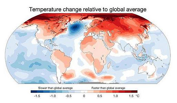 Just look at the map above. It was recently presented by a professor from the English University of Reading. The shades of red and blue represent the amount of warming relative to other parts of the Earth. Below the dark red of the rapidly warming Arctic region, there’s a big blue bullseye to the south of Greenland, in the North Atlantic. The dark blue bullseye, indicating cooling temperatures, might seem like an encouraging development on a warming planet, but it is just the opposite; it is a warning sign that the climate system is malfunctioning.