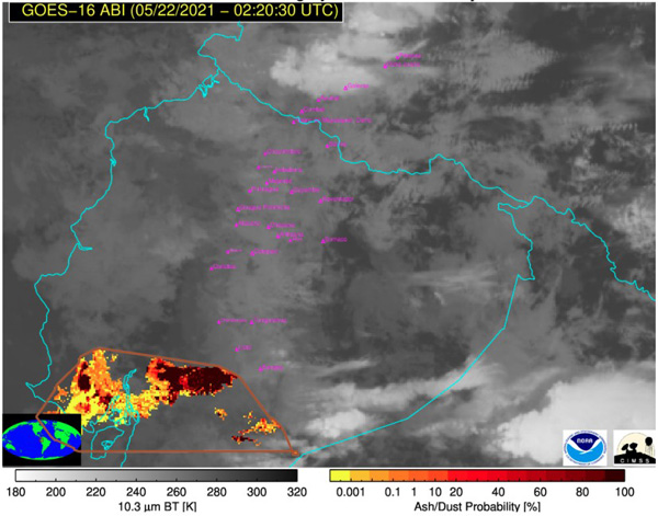 Le Sangay (Équateur) a connu un nouvel épisode éruptif le 22 mai 2021 à 00h20 (UTC) avec des fontaines de lave atteignant 500-1000 m au-dessus du cratère (voir la vidéo ci-dessous). La couleur de l’alerte aérienne est momentanément passée au Rouge avant d’être ramenée à l’Orange. Le panache de cendres qui a accompagné la crise éruptive est monté à 9,1 km d’altitude. De légères retombées de cendres ont été signalées dans plusieurs localités.