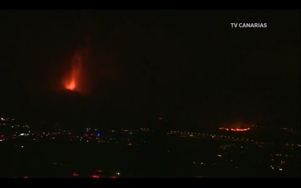 Eruption du Cumbre Vieja le 22 septembre 2021 au soir, avec le front de coulée à droite de l’image (Capture écran webcam)