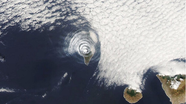 NASA has released an image (see above) taken last weekend by the Aqua satellite. One can see a mysterious pattern of concentric waves above Cumbre Vieja. There is an ash cloud shaped like a target with Cumbre Vieja in the center of the target