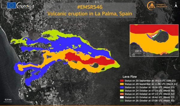 12 heures : Dans ses derniers bulletins, l’IGN indique que la lave continue à s’échapper du Cumbre Vieja, mais les nouvelles coulées ont tendance à recouvrir les précédentes ainsi que les îlots de végétation (kipukas) épargnés jusqu’alors. En conséquence, l’épaisseur du champ de lave est de plus en plus importante. La surface recouverte par la lave n’a guère évolué au cours des derniers jours; le 26 octobre elle a été estimée à 908,2 hectares dans les données Copernicus. Le nombre de structures détruites reste à 2162.