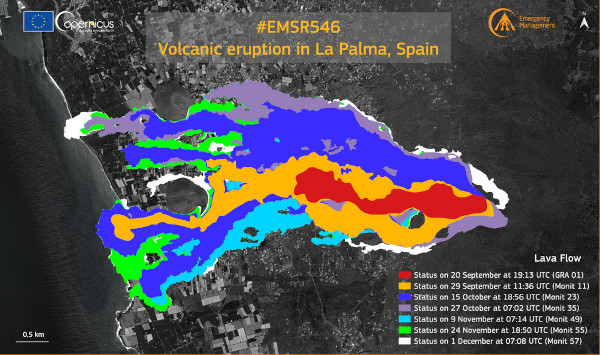 Les données Copernicus sont d’une grande utilité pour évaluer la superficie des coulées de lave et estimer les dégâts causés par l’éruption