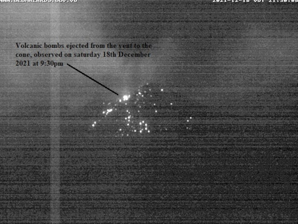Dans un premier communiqué diffusé le 22 décembre 2021 à 02h15, l’OVPF indiquait que « depuis 01h15 heure locale (21h15 UTC), une crise sismique est enregistrée sur les instruments de l’OVPF. Cette crise sismique est accompagnée de déformation rapide depuis quelques minutes. Ceci indique que le magma est en train de quitter le réservoir magmatique et se propage vers la surface. Une éruption est probable à brève échéance dans les prochaines minutes ou heures. »