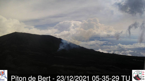 OVPF wrote this morning on its Facebook page that « even though activity has declined, a lava fountain regime can still be seen. » The latest images provided by the Piton de Bert webcam do not show any red glow; only a small plume of bluish gas is released by the eruptive site. Does this mean that the eruption is going through its last hours? Yesterday, only the lowest fissure was still active …