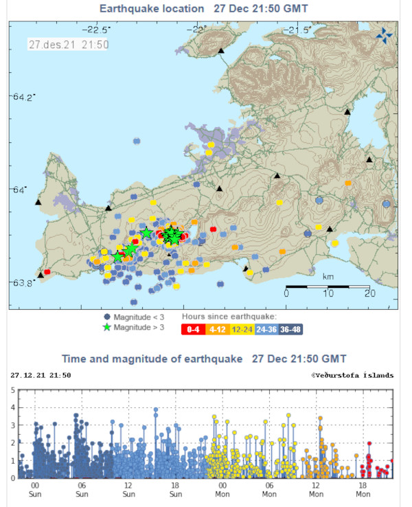 Seismic activity is still elevated on the Reykjanes Peninsula, although it was less intense in the last hours. 1,300 events were recorded on December 27th, versus 3,300 on December 26th.