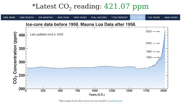 Levels of the gas continue to rise, when they need to be falling. This year’s carbon dioxide level is nearly 1.9 ppm more than a year ago, a slightly bigger jump than from May 2020 to May 2021.