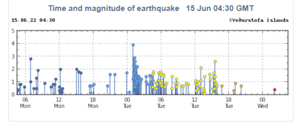 Hard luck! A few hours affter the Uncertainty Phase has been lifted, an earthquake at the size of 3.9 M was recorded around 1 AM on June 14th, 2022 north of Grindavík on the Reykjanes peninsula. Approximately 100 earthquakes followed this event. The Icelandic Met Office says « this is the biggest series of earthquakes since the 15th of May when there were earthquakes around Eldvörp on the Reykjanes peninsula. » Local scientists explain there are no signs of lava breaking through the earth’s crust. It will be interesting to see if the GPS measurements will reveal ground movements in the area.