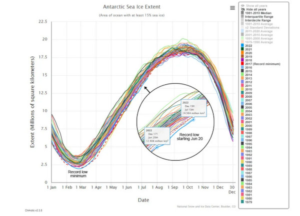 Ce graphique montre le cycle saisonnier de l’étendue de la glace de mer antarctique, en millions de kilomètres carrés, de 1979 jusqu’au 13 juillet 2022. La vue en médaillon montre la tendance des dernières semaines et met en évidence les étendues extrêmement faibles enregistrées depuis le 20 juin. ( Source: NSIDC)
