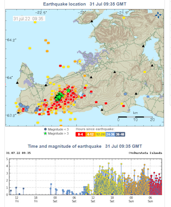Although it seems to have lost some intensity, the seismic swarm continues on the Reykjanes Peninsula. This Sunday, July 31st, 2022, events with a magnitude greater than M 3.0 are still recorded, but only one exceeded M 4.0 (M 4.2 very early this morning). Most hypocentres are between 3 and 4 km deep. According to Icelandic volcanologists, this seismicity is probably due to magmatic intrusion or movements of magma below the surface.