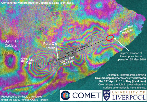 Exemple d’interférogramme InSAR du Kilauea pendant l’éruption de 2018 (Source: NASA / Université de Liverpool).
