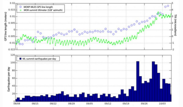 Graphiques montrant la déformation du sol (en haut) et la sismicité (en bas) sur le Mauna Loa entre le 8 août et le 5 octobre 2022 (Source: USGS / HVO)