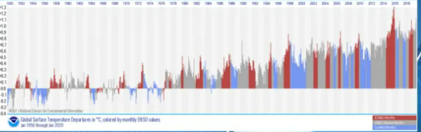 Anomalies mensuelles de la température globale depuis janvier 1950 (Source : NOAA)