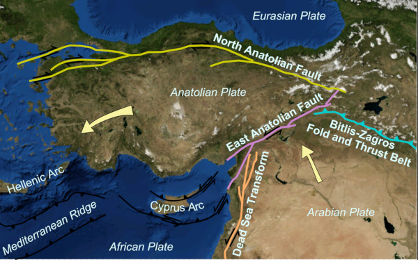 Turkey, a hotbed of seismic activity, sits on the Anatolian Plate, which borders two major faults as it grinds northeast against Eurasia. The North Anatolian fault traverses the country from west to east and the East Anatolian fault rests in the country’s southeastern region.