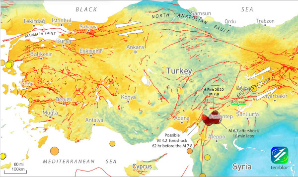 Il ne s’agit pas de volcans, mais d’un événement géologique majeur. Un puissant séisme, dont la magnitude a atteint M 7,8 selon l’USGS, a frappé la région frontalière très peuplée de la Turquie et de la Syrie à 04h17 (heure locale) le 6 février 2023.
