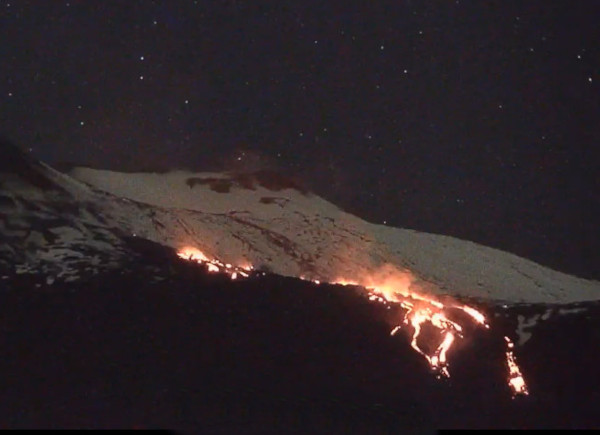 The vents at the NE base of Mt Etna’s SE Crater (Sicily), at about 2,800 m elevation, continue to feed lava flows. The flow rate is highly variable with an increase on February 1st, 2023, a gradual decrease in the following hours, and a complete cessation on the morning of February. 2nd. Later, lava again effused from the vent and traveled over pre-existing flows. In its latest update of February 7th, INGV indicates that lava is no longer flowing.