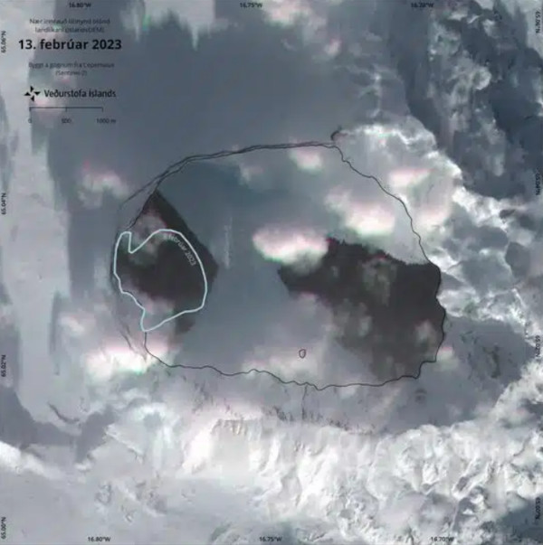 In a post published on February 12th, 2023, I indicated that a series of satellite images of Askja showed large thaw holes in the ice on Oskjuvatn, as compared to previous years. Scientists then said that the holes were big and could only be explained by increased geothermal heat in the water.