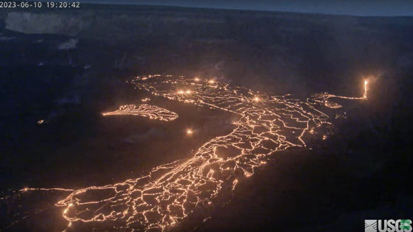 Multiple minor fountains remain active in the western part of thecrater floor. A vent is also active on the southwest wall of the caldera. Lava fountain heights have decreased since the eruption onset, but remain up to about 9 meters high. Active lava and vents cover much of the west half of Halemaʻumaʻu crater in a broad horseshoe around a central uplifted area. (see screenshot below). An active lava lake is centered within the uplifted area and is fed by a vent in its northeast corner. A much smaller area of lava also remains active in the eastern portion of the crater floor