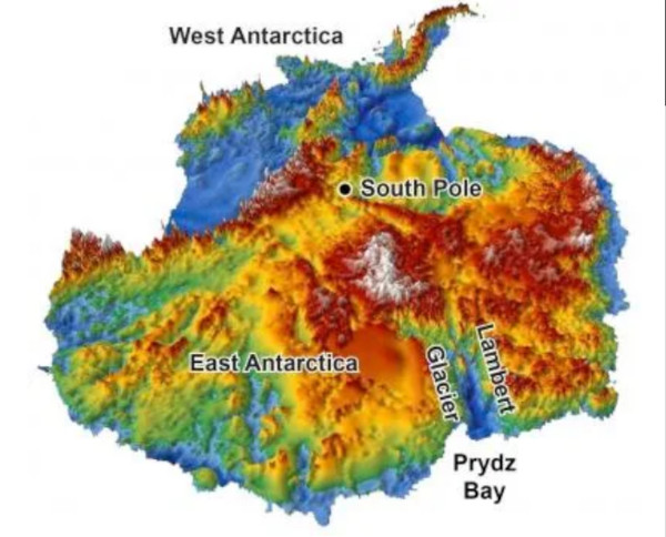 Reconstruction of the topography hidden under Antarctica’s ice. The continent was relatively flat before glaciers started carving deep valleys 34 million years ago. (Source: Stuart N. Thomson/ UA department of geosciences )