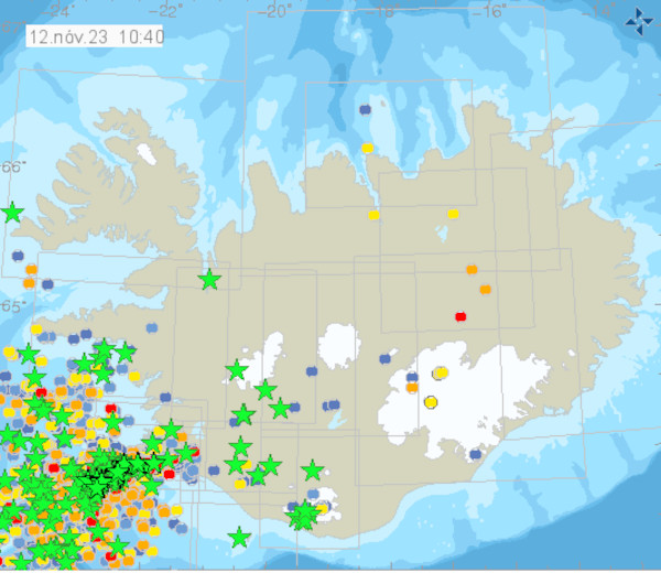 The situation in Iceland has not changed significantly in recent hours. The Met Office map (see below) showing seismicity in the country is impressive, with an incredible number of green stars which refer to events with a magnitude greater than M 3.0. The concentration of stars is mainly located in the southwest of Iceland, on the Reykjanes peninsula and continues out to sea where earthquakes follow the Reykjanes ridge. This is why Icelandic volcanologists do not rule out a more explosive eruption at sea, without forgetting that the magmatic intrusion previously passed under the town of Grindavik which was evacuated, just in case. The length of this intrusion is estimated at around fifteen kilometers from north to south, with a minimum depth of 800 meters. The magma is at a shallow depth, which increases the probability of an eruption, but eruptive prediction stops there. We do not know when or where it could take place, without excluding an abortion, as I described it in July 1990 in the Krafla region. But one must admit that the prediction is very largely in favor of an eruptive event. We must of course keep our fingers crossed that lava will not emerge in the heart of Grindavik.