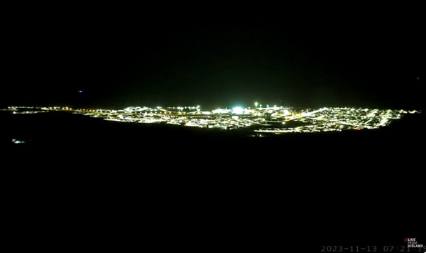 Le jour ne s’est pas encore levé à Grindavik et tout est calme dans la ville (Image webcam)